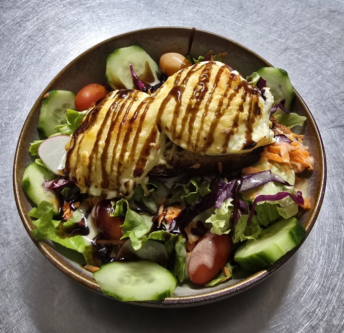 Salade Paysanne (Salade, crudités, lardons, gésiers, œuf poché) |