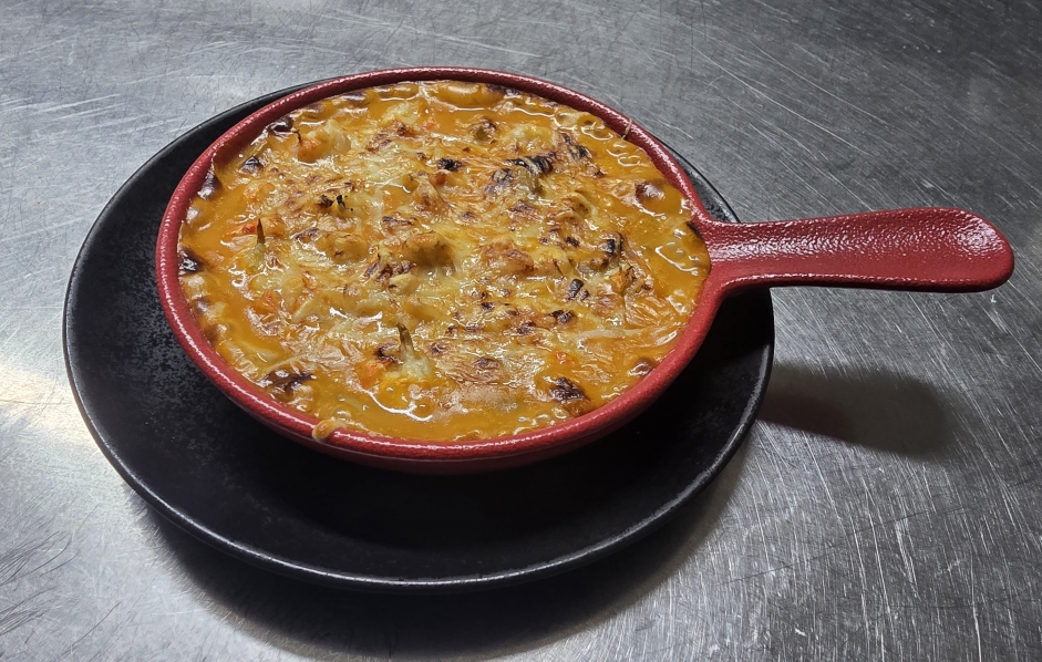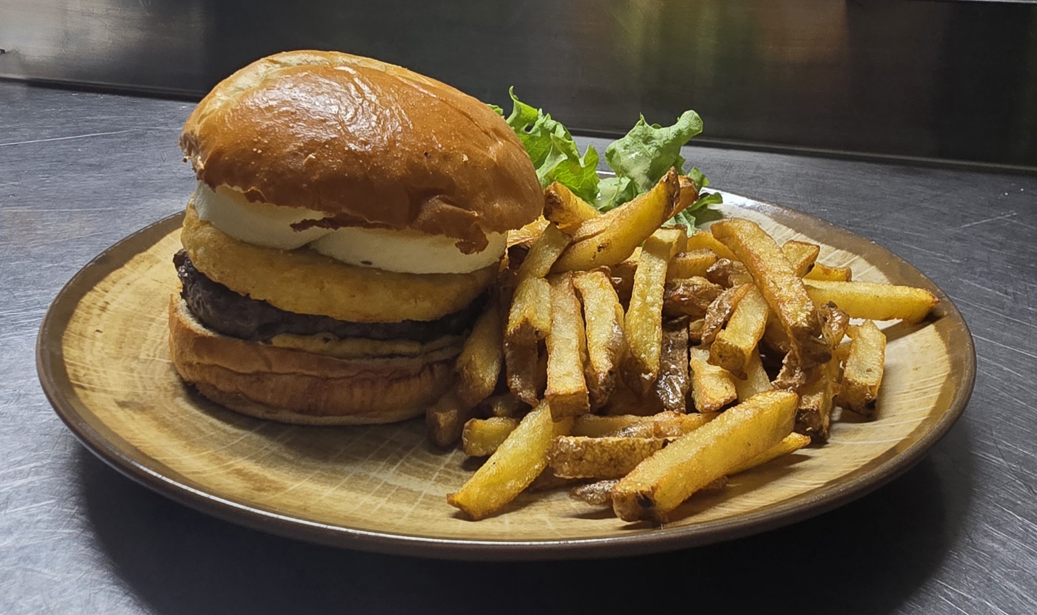 Steack haché façon bouchère, galette de pomme de terre, époisses, oignon rouge, sauce moutarde miellée, frites fraîches «maison» |