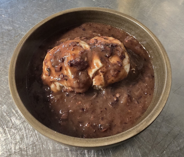 Steack haché façon bouchère, galette de pomme de terre, chèvre frais, oignon rouge, sauce moutarde miellée, frites fraîches «maison» |